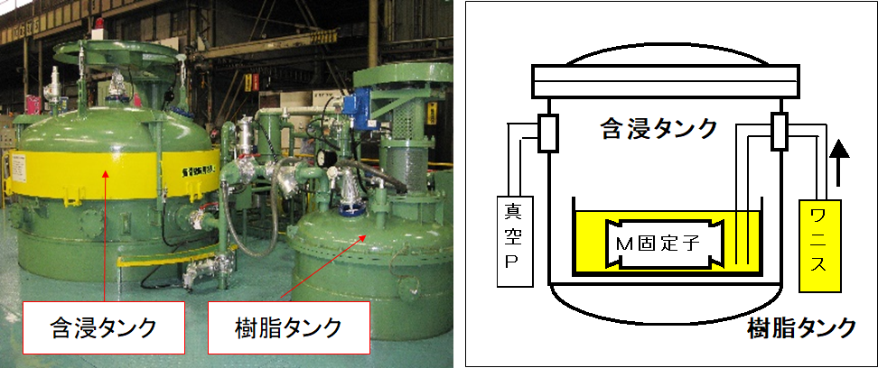 高圧電動機は、絶縁層に発生した空隙やコイルと鉄心間の隙間にワニスを充填する必要があるため、電動機一体の真空加圧含浸処理を実施しています。