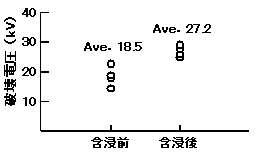 含浸前は絶縁破壊電圧が平均18.5kVであったのに対し、含浸後は平均27.2kVと大幅に向上しています。