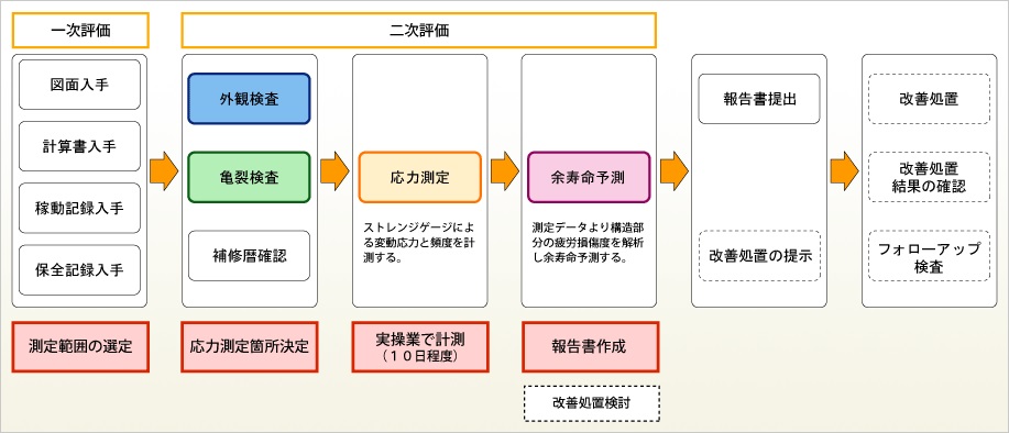 現在ご使用のクレーンに対して、安全かつ安定的に操業していただくために、現時点での疲労損傷度を算出し、過去の運転履歴データを踏まえ現状からの余寿命を予測します。